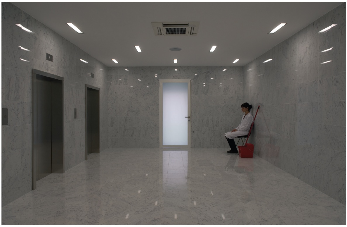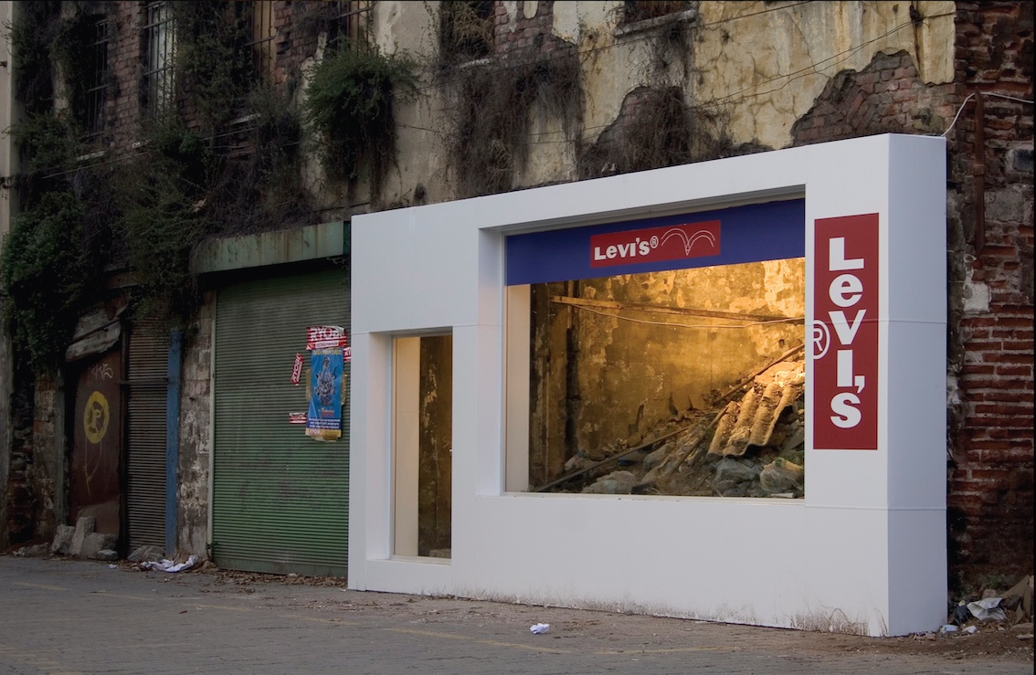 Morton also produces works approximating the real scale of architecture. Within a Warsaw shopping strip, an empty shop was converted into a café Morton recalled from his student days, a remembrance of another time and place filtering up from beneath the Polish present. A shopfront gallery in Sydney was turned into a locksmiths (and permanently locked), another in Melbourne was clad with fake brick to deter entry. In the decayed, collapsing back streets of Istanbul, Morton inserted a brand-new Levi’s boutique shopfront, framing the dramatically lit rubble behind. Within an underground cave, just like the hiding place from which they hauled Saddam, existed not filthy squalor but a generic hotel corridor extending endlessly.