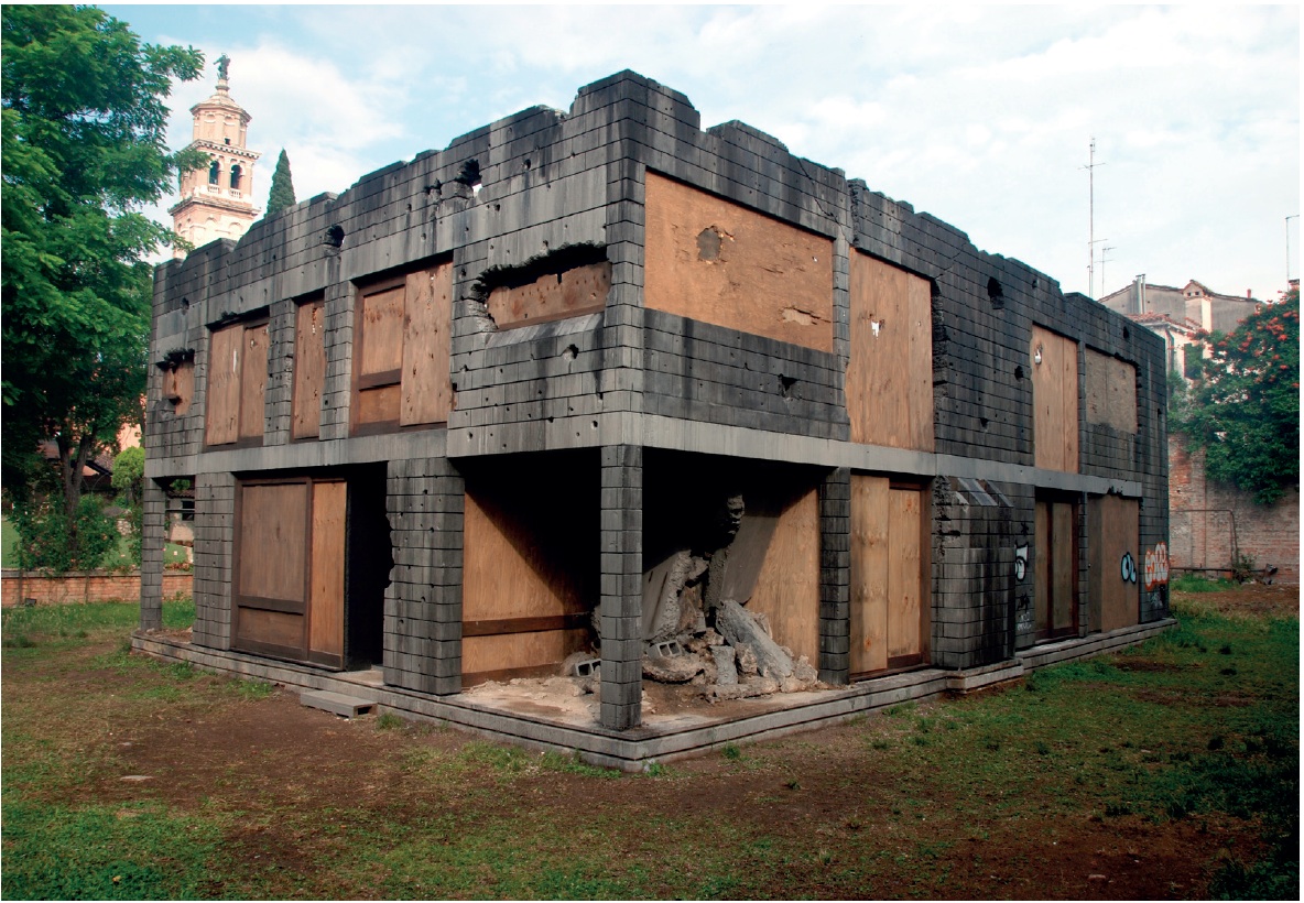 Morton’s bombed-out modernist house resembles some of those left standing in Lebanon, the Gaza Strip, Kosovo, Baghdad, and elsewhere. But this house is based on Morton’s family home, designed by his father, a modernist architect working in Australia. The house was briefly inhabited by Morton’s family before being sold to a developer – destroyed, reduced to rubble, the land excavated and a new, larger faux-‘period’ home built. The three-quarter-scale model appeared as a beautiful smoking ruin in the gardens of Palazzo Zenobio in Venice. Partly a gesture of high regard for his father’s practice and a reverie on his family life, it also appears devastated by a bomb blast, a symbolic act of terror in CAD, merging TV images of some kid’s devastated home with Morton’s own relatively peaceful private life in middle-class Melbourne.