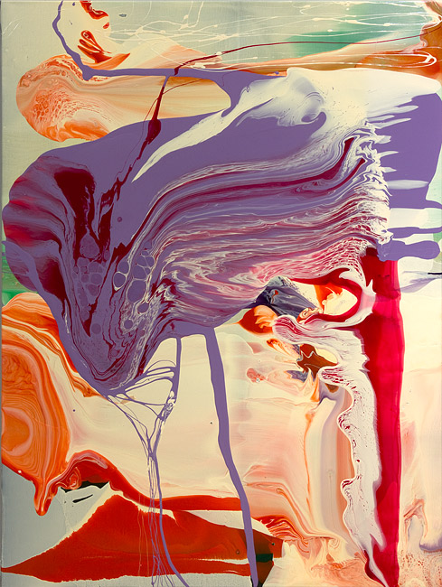 I can’t believe that all that paint and varnish, glistening ‘wet’ and sitting in discernibly deep pools on the surface, is hanging there vertically in front of me in solid state. It defies gravity. Indeed, the most amazing works look gaseous, entangled vaporous mists that have been instantaneously arrested in clear acrylic, like photographs of space snapped from Hubble. It hasn’t always been the case, with prototypes taking a year or two to dry, sagging toward earth, some dripping to the floor during exhibitions. But since the late 90s Frank has experimented with technical developments in materials to perfect the varnish works on canvas that he is now most famous for; works that seem to happily – impossibly – combine the three molecular states of matter.