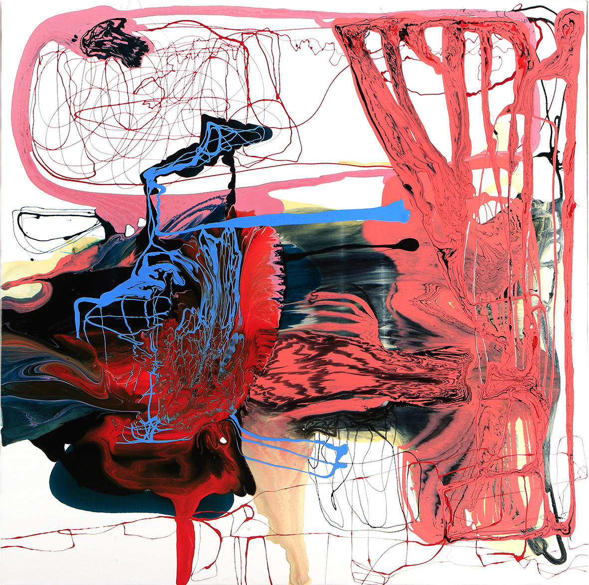 Indeed, of all the things running through our minds everyday, only some cross the liminal threshold into speech or writing, or, in this case, the title of a painting. And these concatenations in Frank’s mind, these synapses, which are then set in language compare to the reactions fixed upon his canvases, chemical reactions within a continuum of matter.