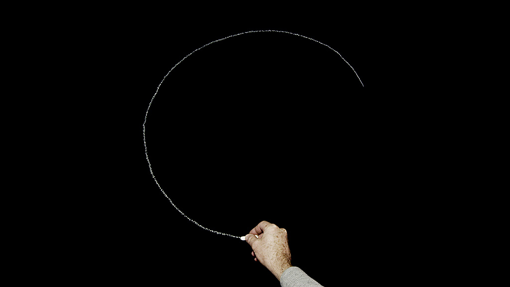 A black ground is interrupted by a single vertical line from which is suspended a circle increasing in size until the ground is completely white, but then interrupted by a single dark line from which is suspended a growing darker circle. This is the visual effect on Daniel Von Sturmer’s video of alternately pouring paint into pools, one on top of the other.
