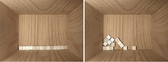 And all those wooden cubes, which seem to shuffle endlessly around inside a box looking for a way out, are on the one hand a kind of Brownian motion or convection, but on the other a study of hapless community; a nest of social relationships ultimately confined and doomed by which ever god is off-screen shaking the box. We too are observable phenomena to someone.