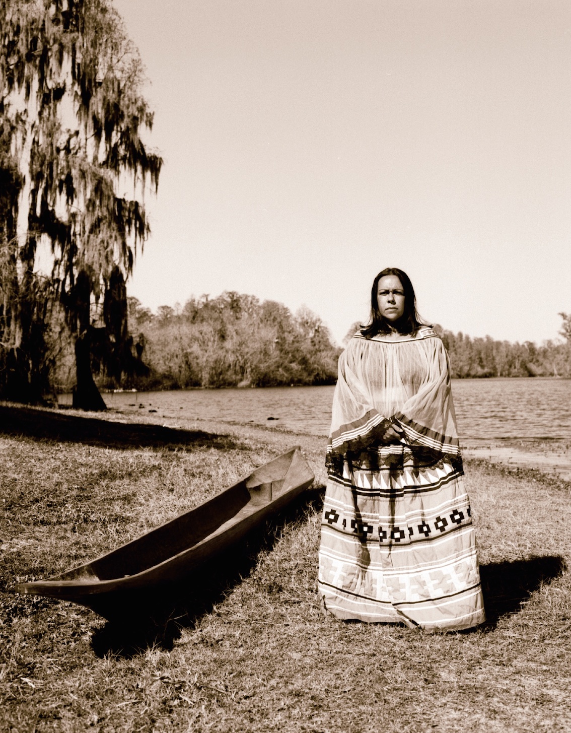 But Foley next appeared in seven tableaux modelled on fashion spreads taken from Oprah Winfrey’s O Magazine. The original fashion shoot featured all-American cowboys and one cowgirl on a ranch. Foley’s version, however, included Seminole colleagues standing on their reservation in Tampa, Florida, thus reinstating people displaced in America’s settlement who do not appear in glossy media fantasies of American pastoral life. And Foley herself assumed the bearing of a romantic lead, surrounded by men, standing in open fields or by a river.