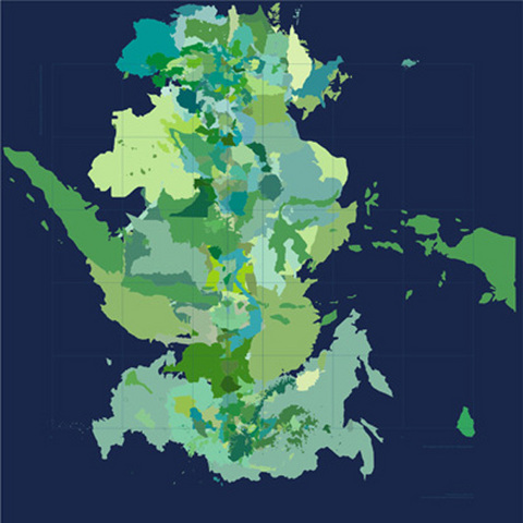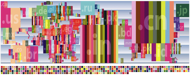Or her maps of proposed equal distribution (by population, literacy, gender, people living with AIDS, internet hosts, etc) where equal sized land masses are randomly, evenly and independently distributed across the globe, each with a fair share of problems and resources (arrows in-between illustrate the redistributions required to achieve balance), although rendered in various intensifying colours.