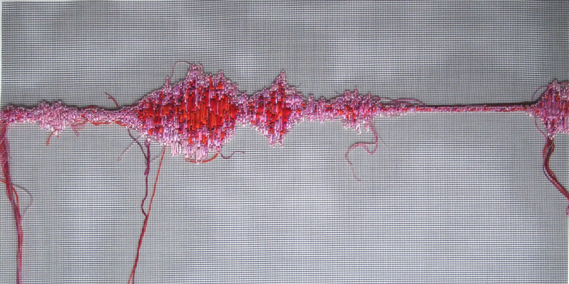 Every second is like, forever, and every year is like 11.3 centimetres, 2007 embroidery floss, fibreglqass screen, each 50cm wide,