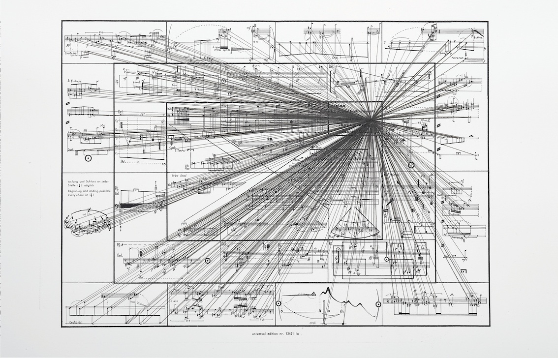 Fusinato’s photography, painting, and music are typically contained in standard formats: frames, stretched canvases, 12” and 7” records, boxed sets. Indeed, Fusinato’s close attention to the material vestige and final product only highlights the work’s unstable ephemeral core, and the original impetus threatens to exceed its neat packaging. The Mass Black Implosions figure it well, like scores for the voluminous encompassing commotion: notes from various musical scores are sucked off the staff into a single black hole of infinite density, an ultimate abstraction notating all and nothing.